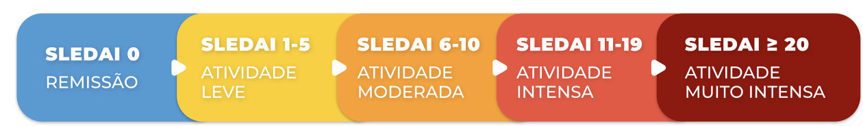 nos 30 dias anteriores à avaliação. O escore total do SLEDAI pode variar de 0 a 105. Um aumento no escore indica maior atividade da doença.
